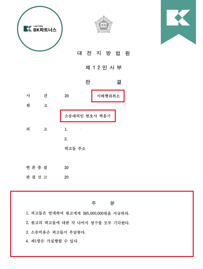 [사해행위취소소송, 전부승소] 대전지방법원 20**가합105392