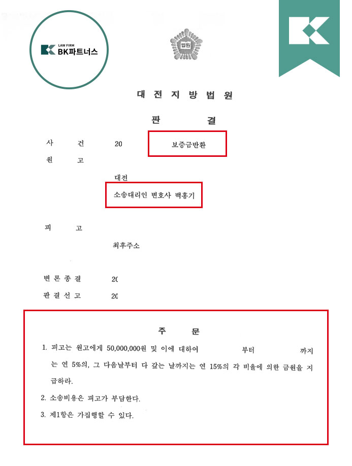 결과그리하여 최종 재판부는 위와 같은 법리에 기초하여 피고에게 보증금 5,000만원을 반환하라고 선고하였고, 의뢰인은 전부승소하여 보증금을 되찾을 수 있었습니다.