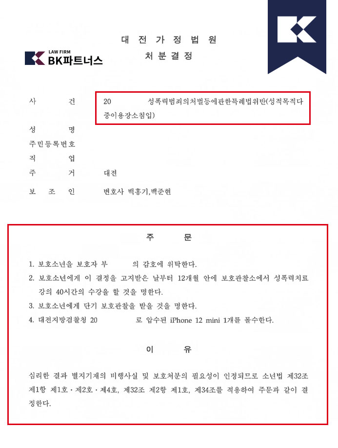 [여자화장실몰카 / 성폭법위반] 20**푸4290 대전가정법원 / 보호처분 1,2,3,4호사건 개요의뢰인의 자녀는 사춘기 시절 성적 충동을 이기지 못하고 PC방 여자화장실에 몰래 침입하여 여러명의 여성이 용변을 보는 모습을 촬영하였고, 현장에서 적발되었습니다. 이후 휴대전화에 대한 압수수색이 진행되었고, 이에 의뢰인은 청소년 성범죄 사건을 다수 수행한 BK파트너스에 사건을 의뢰하였습니다.사건의 해결의뢰인의 자녀는 고등학교 3학년으로, 곧 성년이 되는 연령이었기에 자칫하면 형사처벌 대상이 될 수 있는 상황이었습니다. 이처럼 중대한 시점에서는 수사 초기 단계부터 교화 가능성을 적극적으로 소명하여야 하며, 실무상 대부분이 형사처벌로 이어지는 사례가 많은 만큼, 신속한 대응으로 검찰에서 사건을 소년부로 송치하게끔 하여야 했습니다.이에 BK파트너스는 의뢰인 측과 긴밀히 협조하여 다양한 양형자료를 신속히 확보하고, 교화 가능성에 대한 의견서를 수사기관에 제출하여 검찰로부터 소년부 송치 결정을 이끌어내는 데 성공하였습니다. 이후 소년부 심리에서도 자녀의 반성 정도, 가족의 보호의지, 수능을 앞둔 고3 수험생이라는 점 등을 중심으로, 단기 보호관찰(4호처분)이 타당하다는 주장을 강력히 전개했습니다.그 결과 재판부는 변호인의 주장을 받아들여 4호 처분을 결정하였고, 의뢰인과 그 자녀는 일상을 되찾을 수 있었습니다.