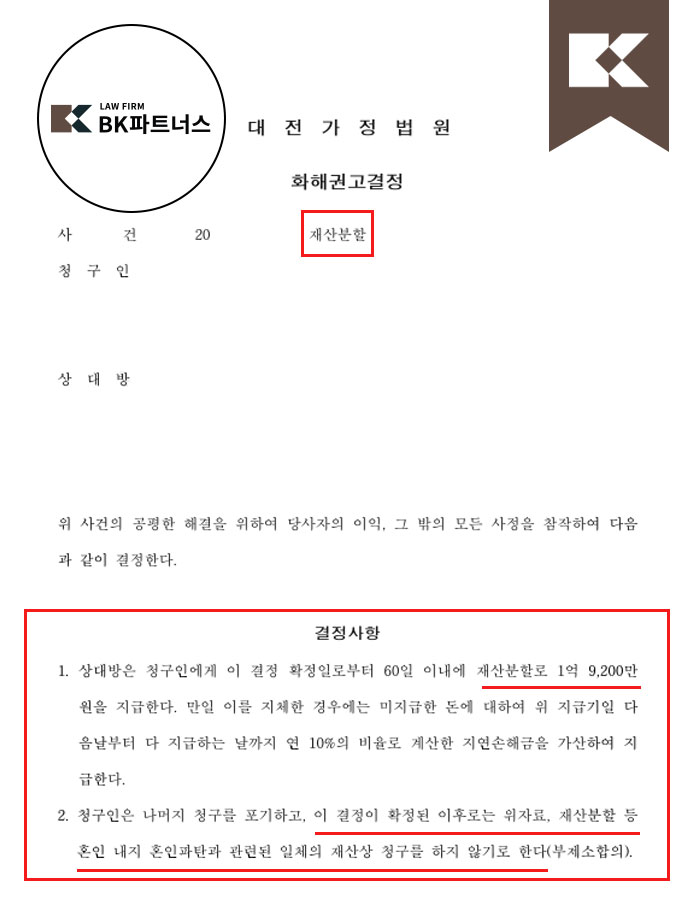 그리하여, 약 2억 원 만을 분할받는 것으로 합의되어 해당 내용으로 화해권고결정을 요청하여 사건을 종결할 수 있었습니다.