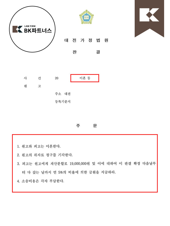 [이혼 및 재산분할 1억3천만원 승소] 대전가정법원 20**드합6054(본소), 20**드합6061(반소) 이혼사건 개요의뢰인(피고)께서는 아내의 불륜을 목격하고 이성을 잃어 아내를 폭행하였으며, 나아가 이를 말리는 자녀까지 폭행하였습니다. 이로 인해 아내로부터 이혼 및 위자료 청구의 소송을 당하게되었는데, 의뢰인께서는 폭행한 사실은 인정하지만 그 경위에 억울함이 있었고, 혼인기간 축적한 재산에 대한 정당한 권리를 되찾고 싶어하셨습니다.사안의 해결BK파트너스의 대전이혼전문변호사는, 반소로서 원고의 외도에 대한 위자료, 나아가 재산분할을 청구했습니다. 소송이 시작되었고 원고 측 변호사는 원고 소유 부동산이 사실은 원고의 어머니 소유로서, 원고는 명의신탁해둔것에 불과하므로 분할대상재산이 아니라고 주장하였습니다. 하지만, BK파트너스의 대전이혼전문변호사는 당해 부동산이 원고와 그 어머니 사이에서는 어머니의 소유라고 볼 수 있으나, 제3자의 입장에서는 온전한 원고 소유라고 변론하며 분할대상재산에 포함하여야 한다고 강력히 주장하였습니다.결과그리하여 최종, 법원은 원고의 외도로 인한 잘못과, 피고(의뢰인)의 폭행으로 인한 잘못이 있다는 이유로 양측의 위자료 청구는 기각하였고, 원고의 명의신탁 주장을 배척하여 부동산을 재산분할대상으로 인정하여, 원고는 피고에게 재산분할로 1억 3천만원을 지급하라는 판결을 하였습니다.