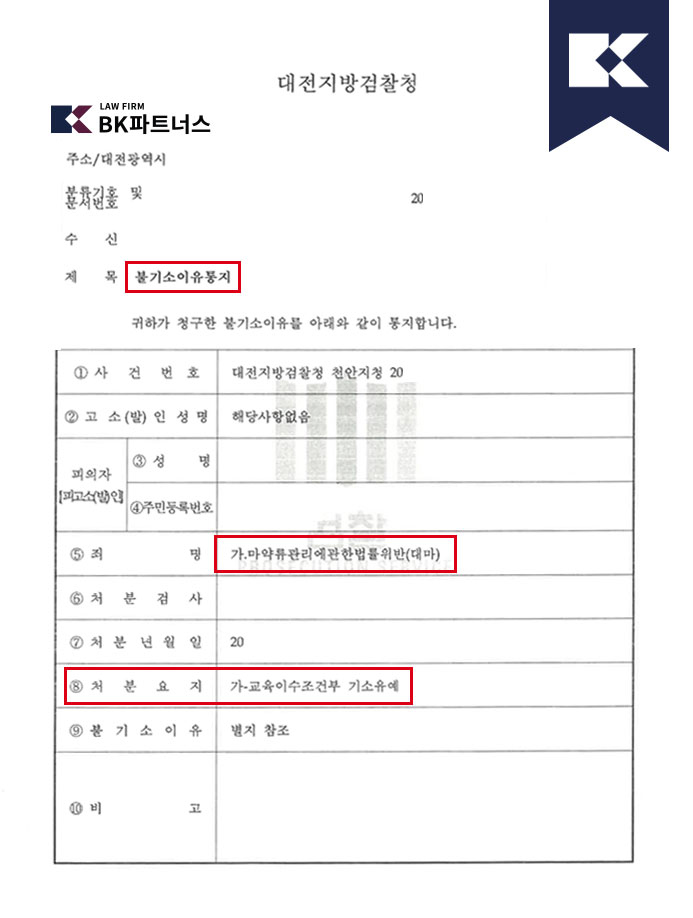 [마약류관리에관한법률위반(대마)] 20**형제6541 대전지검 논산지청 / 기소유예사건 개요의뢰인은 서울 이태원에서 대마를 구입한 후 자택에 보관하며 흡연하였습니다. 이후 거주 중인 아파트 관리사무소로부터 ‘흡연을 삼가 달라’는 지적을 받고, 혹시 대마 흡연 사실이 발각될까 두려워 BK파트너스의 논산마약전문변호사를 찾아오셨습니다. 특히 의뢰인은 과거 마약류범죄로 처벌받은 전력이 있어, 이번에 적발될 경우 실형 등 중형이 예상되는 위기 상황이었습니다.사건의 해결BK파트너스 논산마약전문변호사는 사건 초기부터 적극적인 자수 전략을 제시하며, 자수 시 감형의 가능성과 실익에 대해 면밀히 설명드렸습니다. 이에 따라 저희는 의뢰인을 수사기관에 동행하여 자발적인 자수 절차를 진행하였고, 조사과정에서도 모든 사실관계를 투명하게 밝힐 수 있도록 조력하였습니다.또한, 재범 방지를 위한 구체적인 개선 의지를 보여주는 것이 핵심이라 판단하고, 공공기관 및 전문기관에서 주관하는 마약 관련 교육 프로그램을 선제적으로 수강하도록 안내하였으며, 모든 과정 수료 후 발급된 수료증과 소명 자료를 체계적으로 정리하여 수사기관에 제출하였습니다.그 결과, 수사기관은 자수 사실과 성실한 개선 노력을 높이 평가하여, 의뢰인에 대해 기소유예 처분을 내렸고, 형사처벌 없이 사건을 종결지을 수 있었습니다.