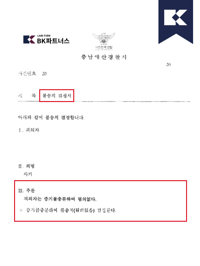 결과그 결과, 수사기관은 의뢰인에 대한 구체적인 기망 및 재산편취 행위를 입증할 증거가 부족하다고 판단하여, 최종적으로 ‘증거불충분에 의한 혐의없음’ 처분을 내렸습니다.