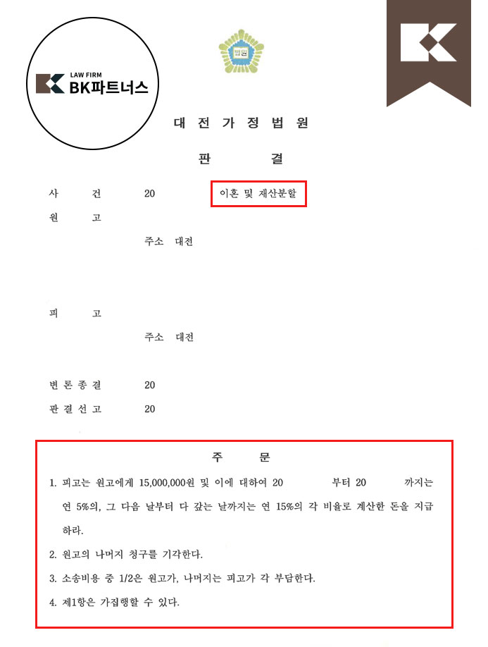 [이혼 및 재산분할 1억3천만원 승소] 대전가정법원 20**드합6054(본소), 20**드합6061(반소) 이혼사건 개요의뢰인(피고)께서는 아내의 불륜을 목격하고 이성을 잃어 아내를 폭행하였으며, 나아가 이를 말리는 자녀까지 폭행하였습니다. 이로 인해 아내로부터 이혼 및 위자료 청구의 소송을 당하게되었는데, 의뢰인께서는 폭행한 사실은 인정하지만 그 경위에 억울함이 있었고, 혼인기간 축적한 재산에 대한 정당한 권리를 되찾고 싶어하셨습니다.사안의 해결BK파트너스의 대전이혼전문변호사는, 반소로서 원고의 외도에 대한 위자료, 나아가 재산분할을 청구했습니다. 소송이 시작되었고 원고 측 변호사는 원고 소유 부동산이 사실은 원고의 어머니 소유로서, 원고는 명의신탁해둔것에 불과하므로 분할대상재산이 아니라고 주장하였습니다. 하지만, BK파트너스의 대전이혼전문변호사는 당해 부동산이 원고와 그 어머니 사이에서는 어머니의 소유라고 볼 수 있으나, 제3자의 입장에서는 온전한 원고 소유라고 변론하며 분할대상재산에 포함하여야 한다고 강력히 주장하였습니다.결과그리하여 최종, 법원은 원고의 외도로 인한 잘못과, 피고(의뢰인)의 폭행으로 인한 잘못이 있다는 이유로 양측의 위자료 청구는 기각하였고, 원고의 명의신탁 주장을 배척하여 부동산을 재산분할대상으로 인정하여, 원고는 피고에게 재산분할로 1억 3천만원을 지급하라는 판결을 하였습니다.